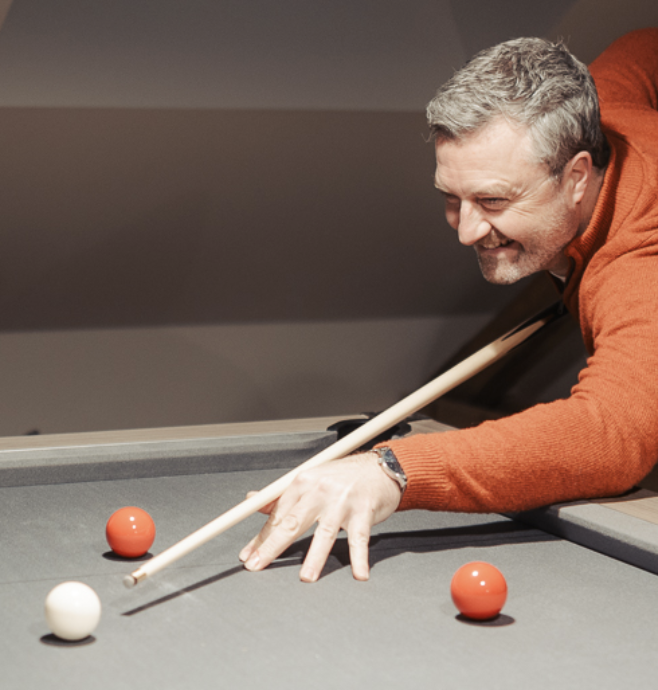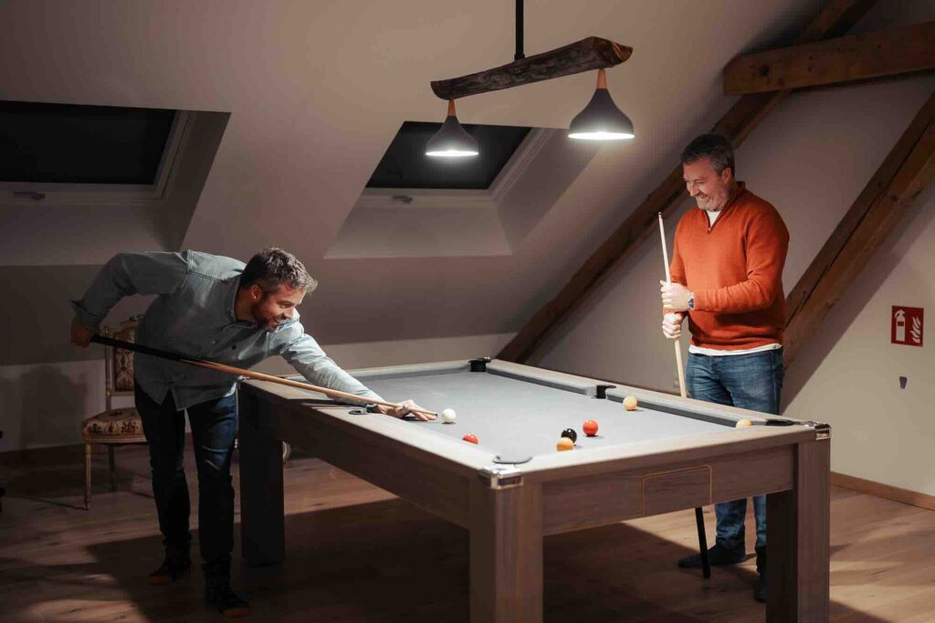 Divertissement & Loisirs : Un espace de jeux intérieur avec billard et kicker, ainsi qu'un terrain de pétanque à l'extérieur.